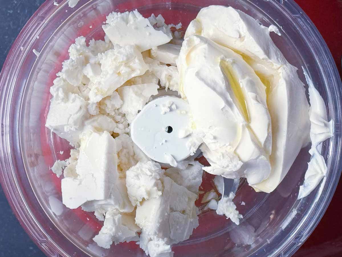 - Crumble the feta into a blender, add the cream cheese, olive oil and lemon juice, then blend briefly until it turns smooth and airy.